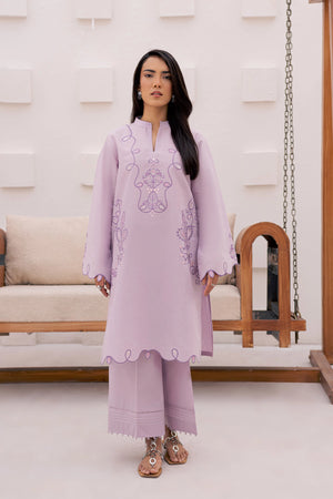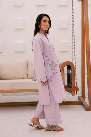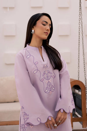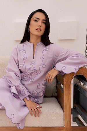TUXEDO is plotted on a Lilac canvas. The soft cotton Shirt features a structured band collar and a precision-stitched open placket. Intricate paisley and floral embroidery in deep purple and cream is strategically placed, providing an organic contrast to the fluid line-work, finished with cutwork.