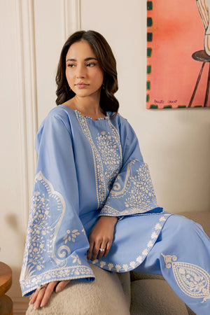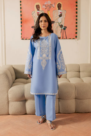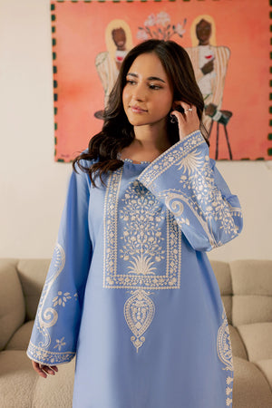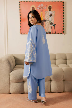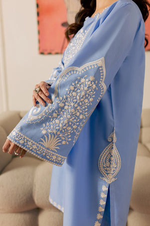 STYLE is a masterpiece, set against a cooling Cloud Blue canvas. The soft cotton Shirt has a round neckline that opens into a grand, tree-of-life-inspired embroidery, layered with shimmering sequin embroidery. From the embroidered bell sleeves to the curved hem, every edge is meticulously framed with signature contrast embroidered trim.